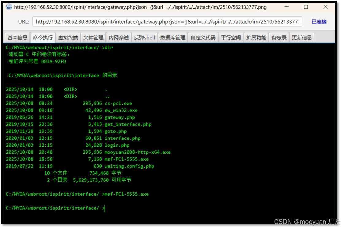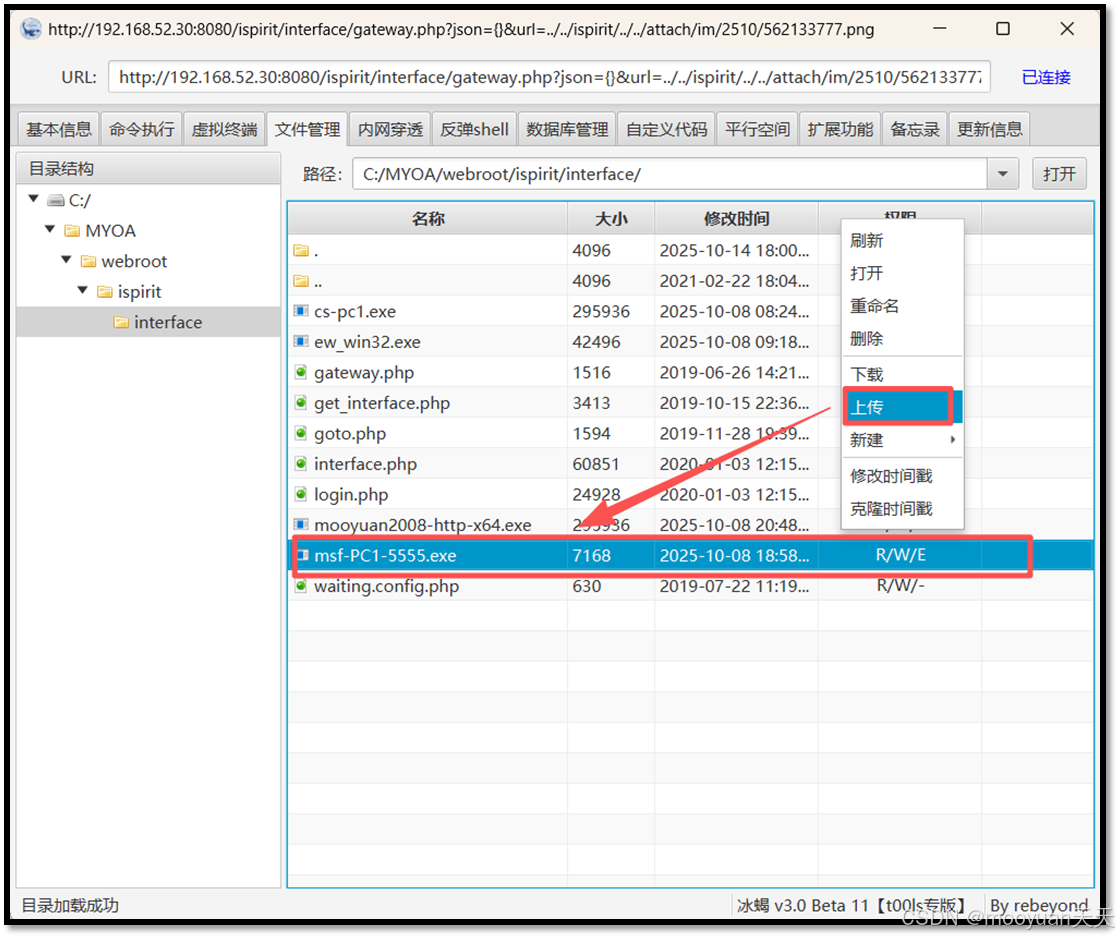 将木马msf-PC1-5555.exe通过冰蝎工具上传,具体如下所示。