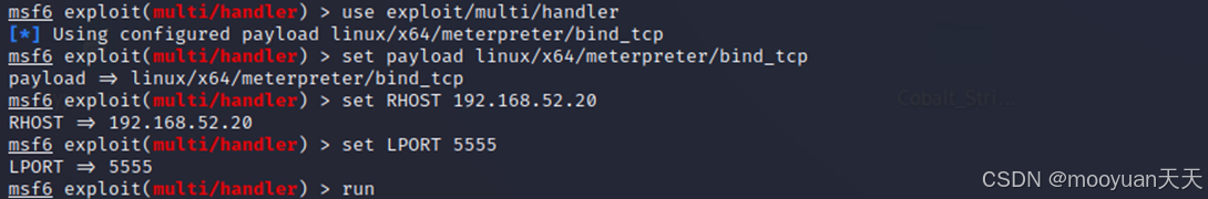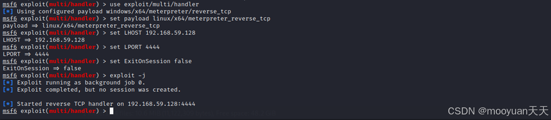 MSF开启监听,特别注意payload要与木马一致( linux/x64/meterpreter_reverse_tcp),具体配置如下所示。