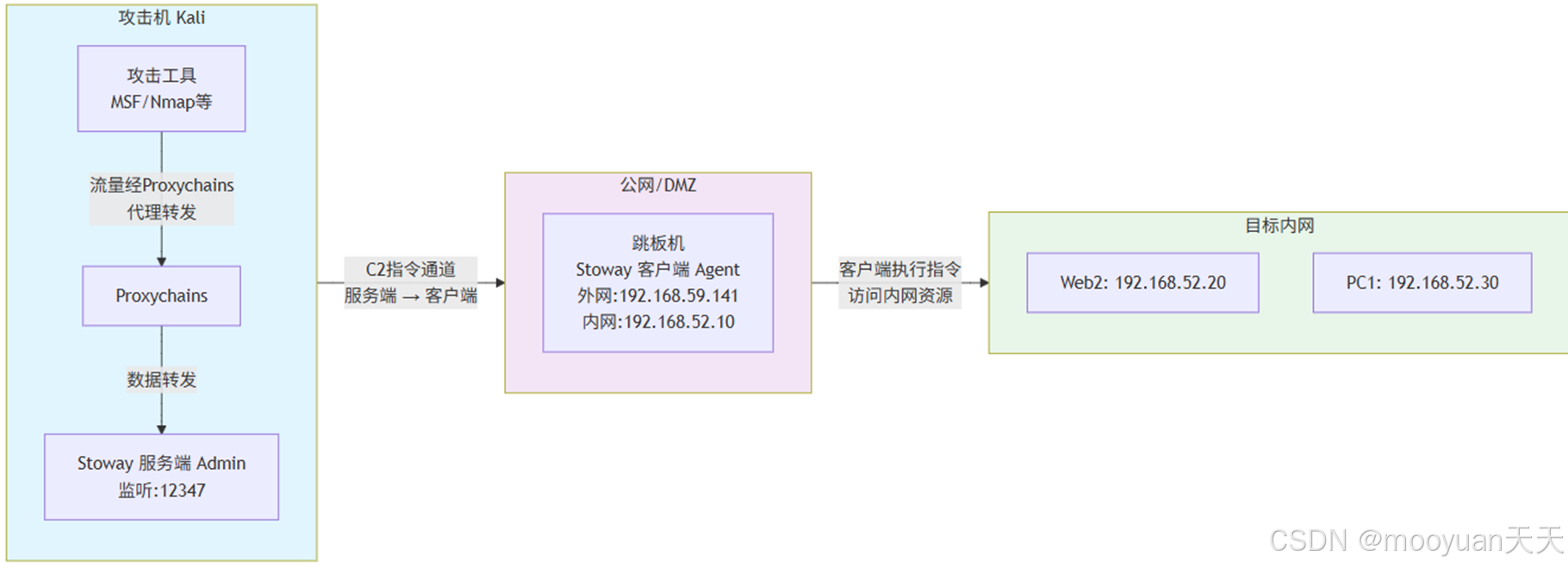 Kali(攻击机)-Web1 (外网跳板机) - 反向代理:使用stoway搭建反向代理连通内网1。