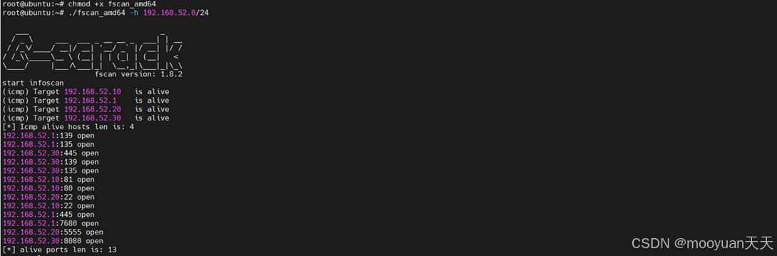 这一步需要打开三个windows虚拟机(Web1,Web2和PC1)探测,首先为fscan_amd64扫描工具添加可执行权限,随后对192.168.52.0/24整个C类网段进行综合资产探测扫描,旨在快速发现存活主机、开放端口及潜在安全风险。