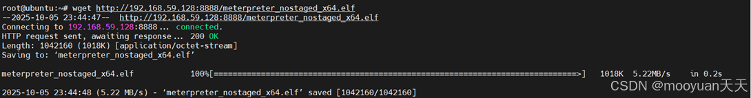 在 meterpreter_nostaged_x64.elf的目录中执行python3 -m http.server 8888。