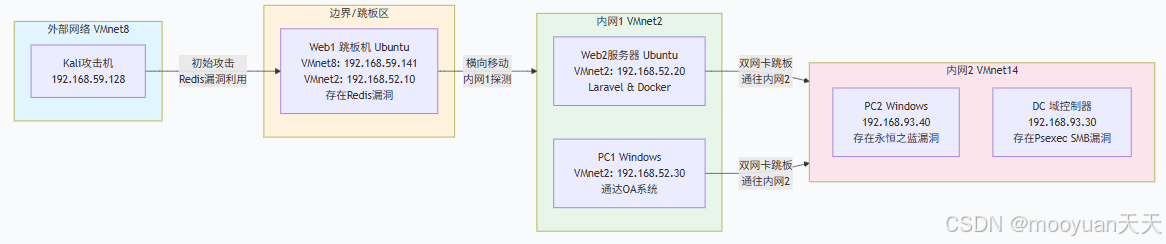 | PC1 | 192.168.52.30 (Vmnet2) 192.168.93.20 (Vmnet14) | 通达OA系统 双网卡主机 | 辅助跳点,连接内网1与内网2 |