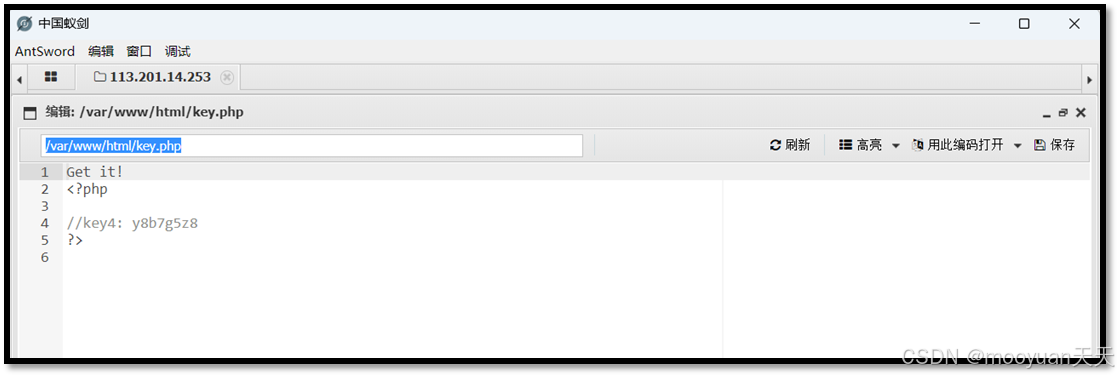 接下来使用cat ../key.php查看key文件,如下所示页面输出“Get it”。