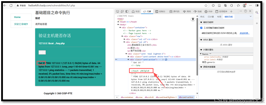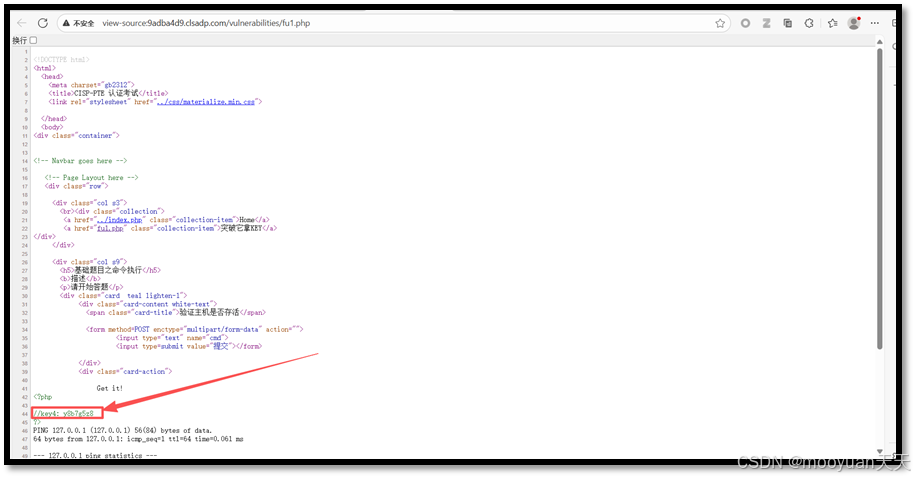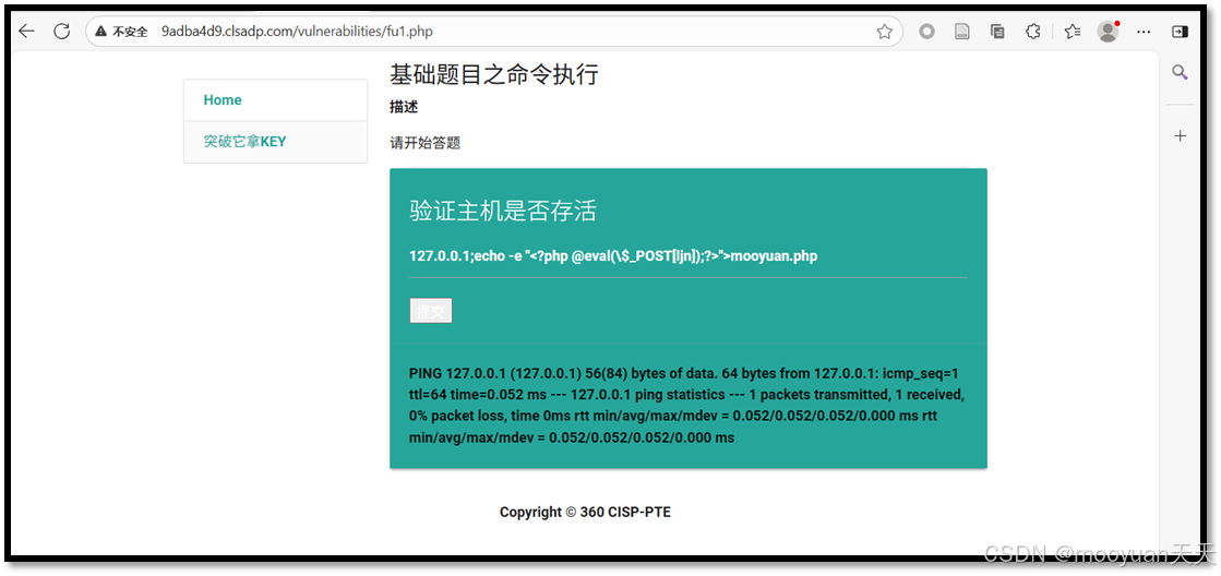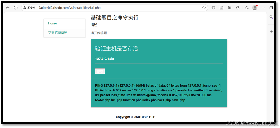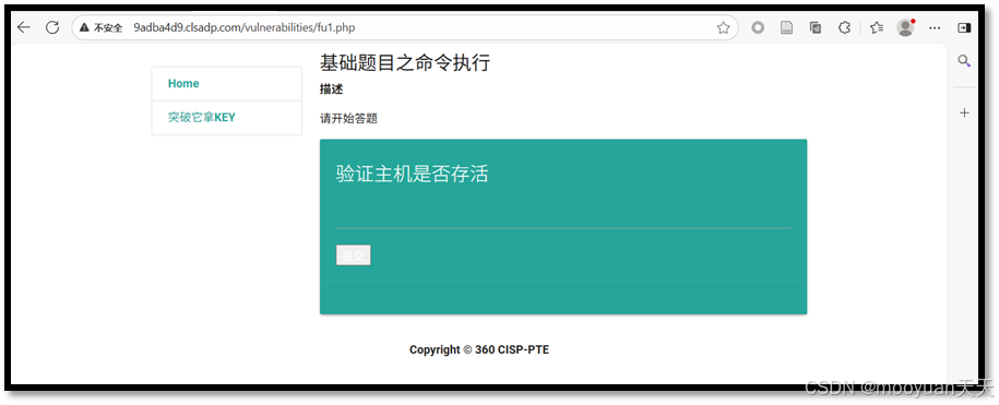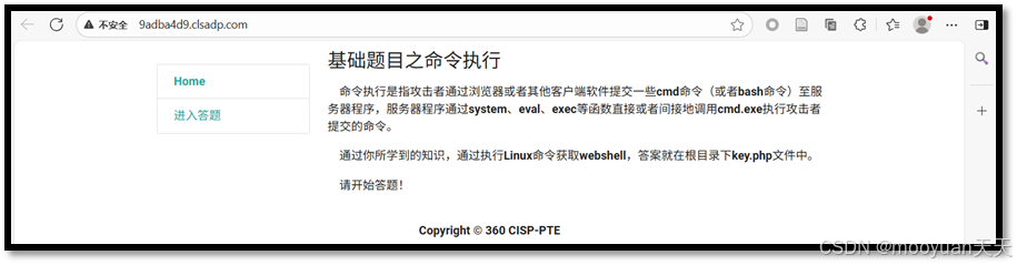 打开靶场,页面提示“ 命令执行是指攻击者通过浏览器或者其他客户端软件提交一些cmd命令(或者bash命令)至服务器程序,服务器程序通过system、eval、exec等函数直接或者间接地调用cmd.exe执行攻击者提交的命令。 通过你所学到的知识,通过执行Linux命令获取webshell,答案就在根目录下key.php文件中。 请开始答题!”