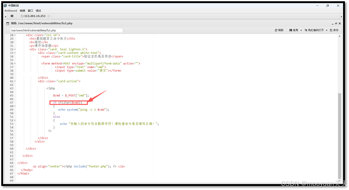 代码实现了一个存在安全漏洞的主机存活检测功能,通过POST表单接收用户输入的cmd参数并调用filter函数进行安全检查。如果filter返回true则使用system函数执行ping -c 1 $cmd命令来检测目标主机连通性,否则显示"敏感字符"错误提示。然而代码存在严重安全隐患:直接将未经充分过滤的用户输入拼接进系统命令,且依赖的filter函数存在逻辑缺陷(错误使用strpos返回值判断),导致黑名单过滤机制失效。攻击者可通过分号、管道符等实现命令注入,执行任意系统指令,属于典型的命令执行漏洞场景,严重威胁服务器安全。完整源码如下所示。