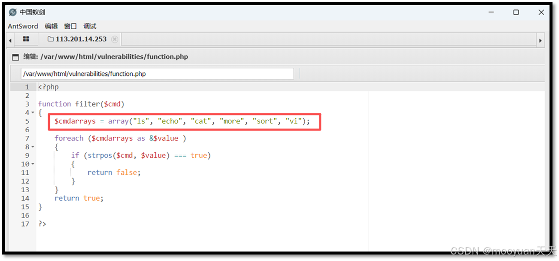 这段PHP代码设计了一个命令安全过滤函数,通过预定义的黑名单数组(包含ls、echo、cat、more、sort、vi等6个常见系统命令)对用户输入命令进行安全检查。函数使用strpos遍历检测输入内容是否包含危险命令关键词,发现则返回false拒绝执行,否则返回true允许通过。然而该代码存在严重逻辑缺陷:strpos函数返回的是位置索引或false,而条件判断误用"=== true"使得过滤机制完全失效,因为strpos永远不会返回布尔值true。正确的写法应使用"!== false"进行检测,此错误导致黑名单过滤功能无效,无法实际防护命令注入攻击,属于典型的安全代码实现缺陷。注释后的源码如下所示。