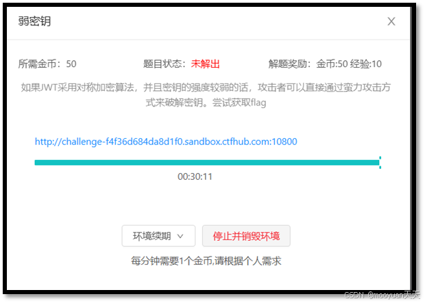 打开靶场,页面提示“如果JWT采用对称加密算法,并且密钥的强度较弱的话,攻击者可以直接通过蛮力攻击方式来破解密钥。尝试获取flag”,具体如下所示。