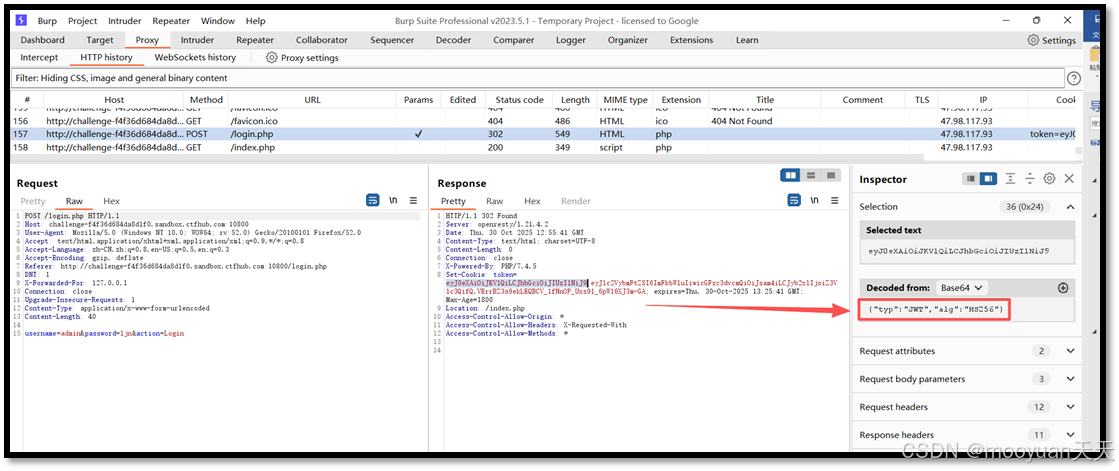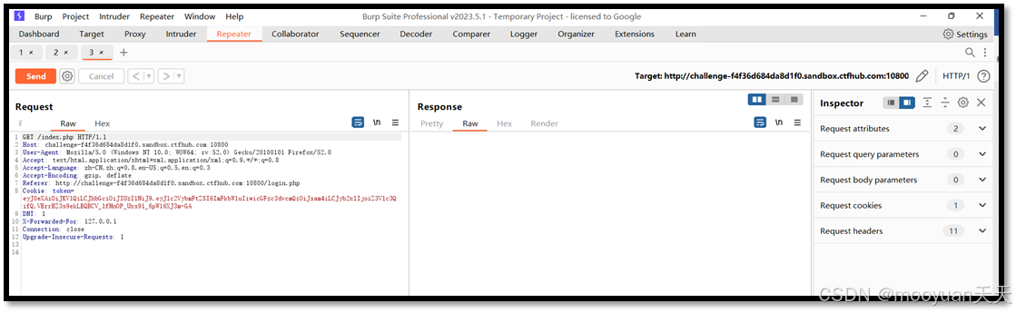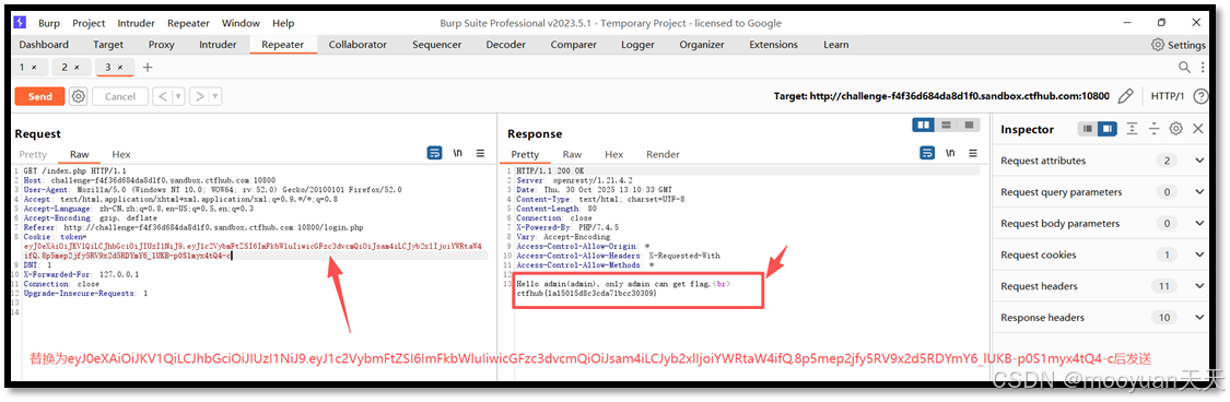 修改token后发送报文,如下所示获取到flag值ctfhub{1a15015d8c3cda71bcc30309}