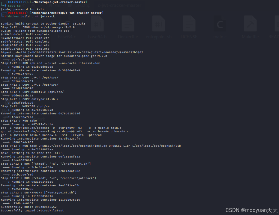 kali中在解压后的文件夹c-jwt-cracker-master中执行sudo docker build . -t jwtcrack命令。