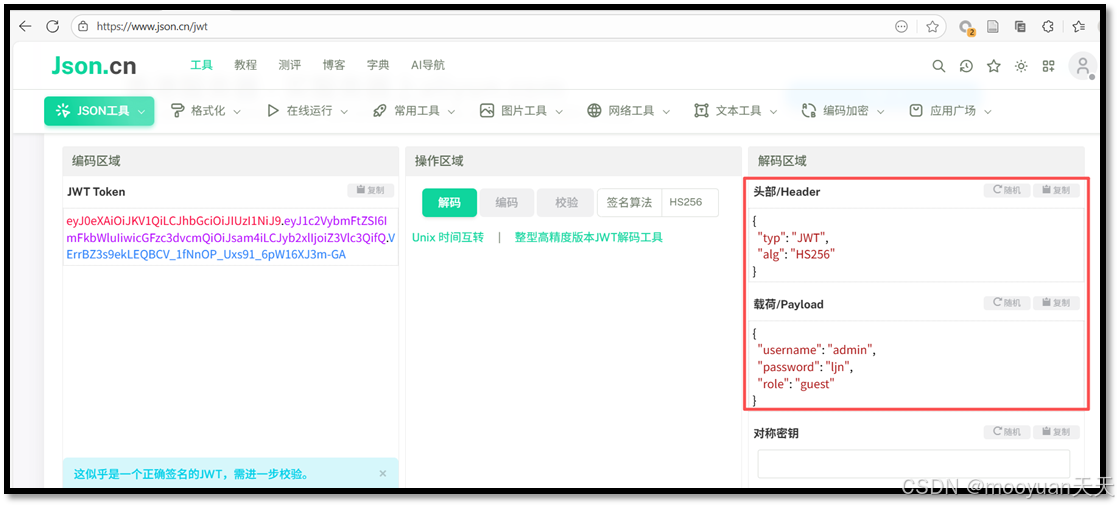 其中第一部分解密后为:{"typ":"JWT","alg":"HS256"}