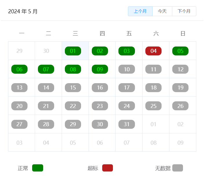 vue中集成 <el-calendar>日历控件,显示数据的状况 在 <el-calendar> 控件的 <template> 中处理具体的颜色显示,使用 v-if 函数调用处理参数,其中添加 slot-scope="{date, data}" 可获取日期和数据。参考链接:https://blog.csdn.net/weixin_56718509/article/details/131699291。vue中集成 <el-calendar>日历控件,显示数据的状况。每个日期上显示颜色方框。