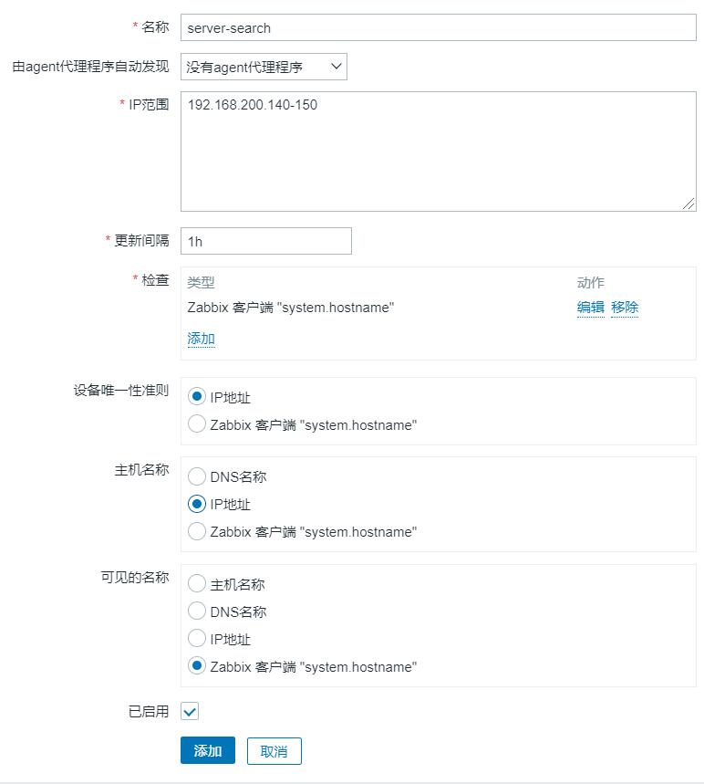 Zabbix主机自动发现 大致步骤1、创建自动发现规则2、创建动作3、配置主机zabbix-agent客户端一 配置规则在右上角创建规则名称:自定义IP范围:你所需要检测的地址范围,我的检测的范围是该网段内的140-150更新间隔:因为是在测试环境,所以可以设置短一些,5m(分钟) 默认是一小时间隔不可写太短,每次更新服务器回去挨个检测IP范围内的地址,影响性能检查:表示zabbix-server以什么方式去检测发现主机,此处为zabbix客户端模式...