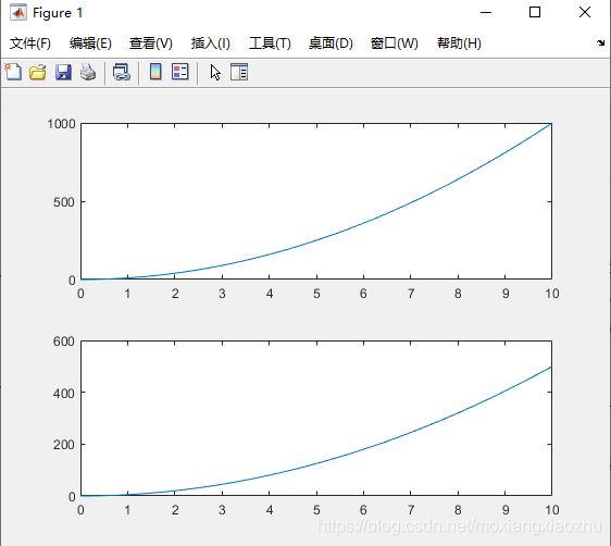 下面利用.m文件分别对g=10,g=5时的系统进行仿真,并绘出高度与时间的关系图。