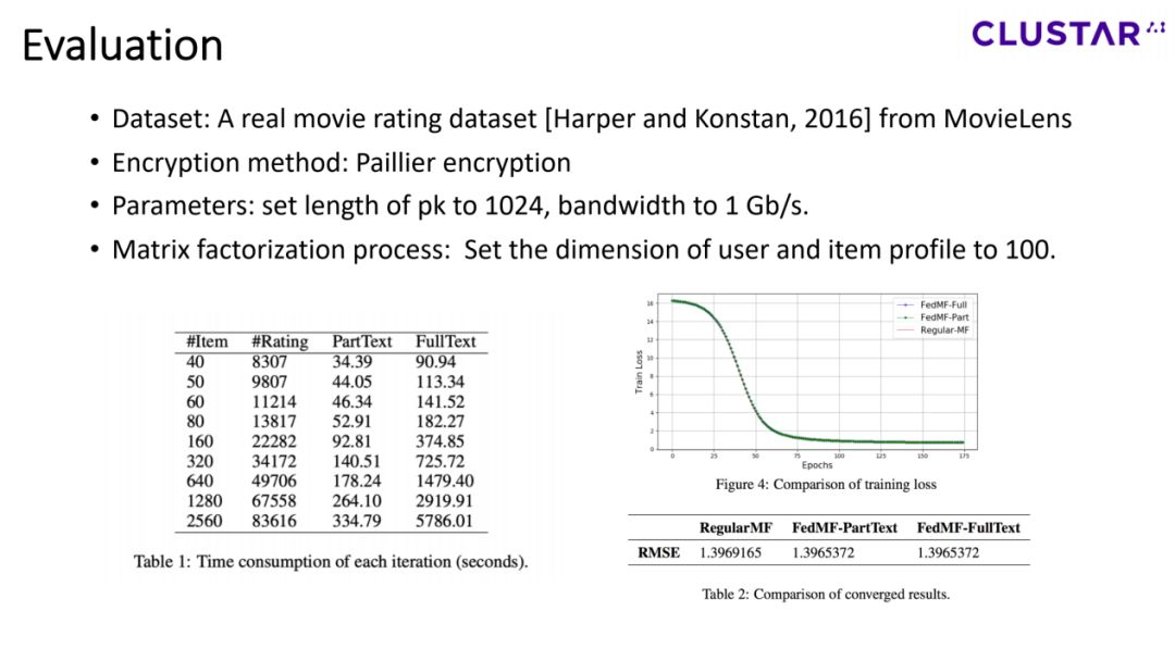 在本文中,星云Clustar团队提出了一个名为FedMF的联邦学习环境下的安全矩阵分解框架,并使用真实的数据集进行测试,测试结果验证了FedMF的可行性。此外,星云Clustar的团队还讨论了FedMF在未来研究中应用的挑战。