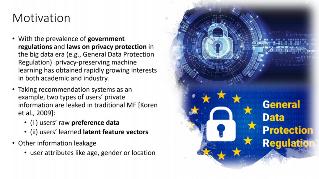 以General Data Protection Regulation为代表,政府开始出台各类规章和法律条文,用来加强对隐私性数据的保护力度,学院机构以及工业企业也因此开始关注隐私保护机器学习这一技术领域。目前推荐系统是一个广受关注的研究课题,矩阵分解是常见的技术手段。