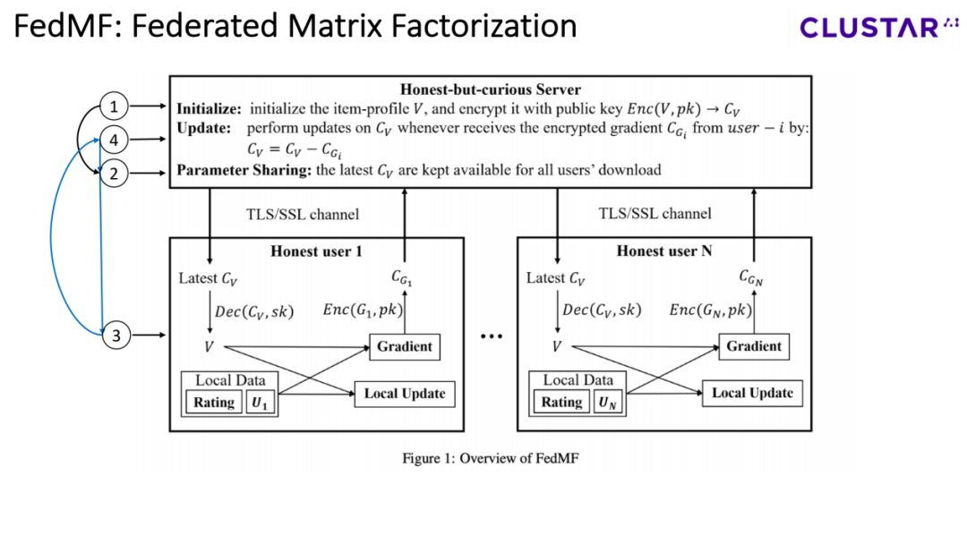 我们的解决方案是对系统中加入homomorphic encryption,也就是联邦矩阵分解系统。假设用户和服务器已经实现了对密钥的生成和分发,其中服务器拥有公钥,用户拥有彼此相同的私钥,那么整个系统就可以分为4个步骤:
