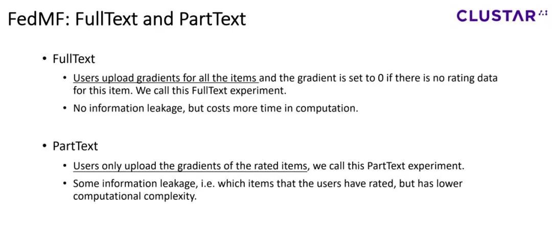 这两种方式有利有弊,parttext会泄漏哪些item是用户打过分的,同时在计算效率上表现更好,而fulltext不会泄漏用户的信息,但是会需要更多的计算耗时。