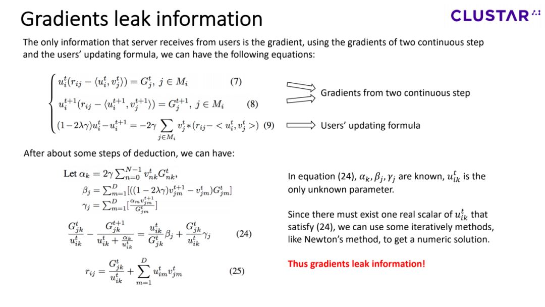 总结来说,服务器只会收到用户的gradient,不会收到用户的任何评分信息。这样看来,我们的任务目标就实现了,但是让我们再思考一个问题,传输gradient就真的能保障用户隐私了吗?