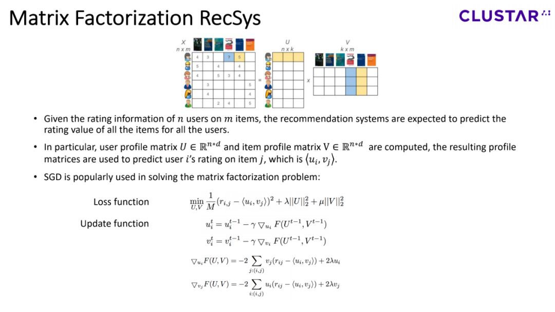一般来说,SGD(Stochastic Gradient Descent,随机梯度下降)是用来解决矩阵分解的主流方法。具体loss function和updating formula的定义如图所示。