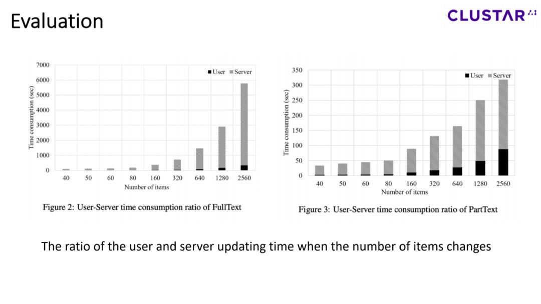 图2和3显示了随着item数量的变化,用户和服务器的更新时间的比例的变化。从图可见,约95%的时间用于了服务器的更新,这就意味着如果我们增加了服务器的算力,或者提升homomorphic encryption方法,以降低密文计算的复杂度,则计算效率会有显著提升。这就是我们下一步要做的主要工作。