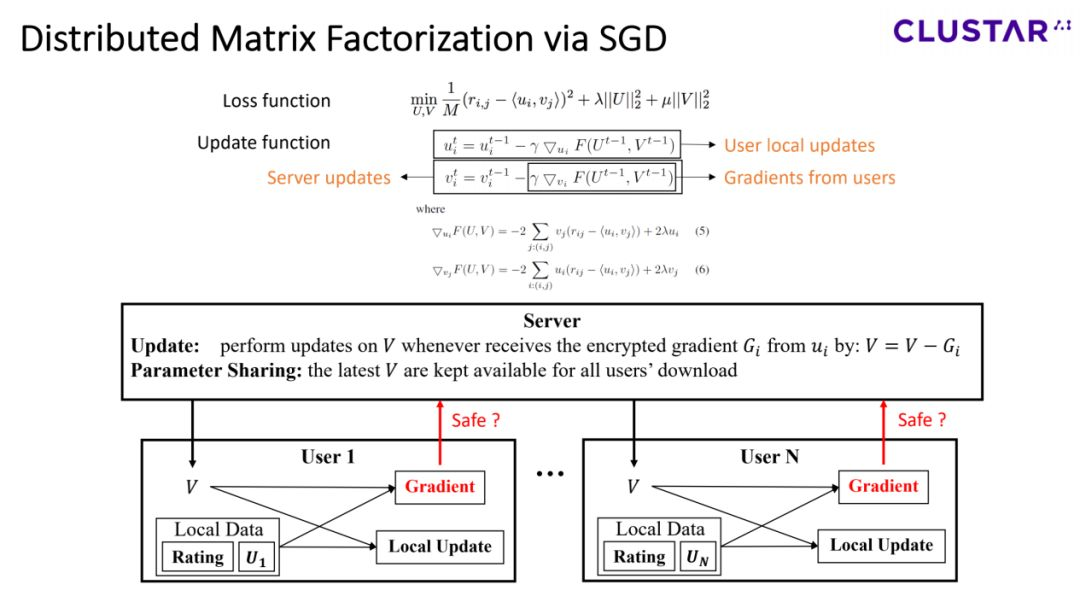基于此,我们设计了一个分布式的矩阵分解系统,在这个系统中,所有的评分数据都掌握在用户手中。一个全局的item profile矩阵为所有用户提供一个本地的update,同时用户将会把gradient传回给服务器,用来更新item profile。