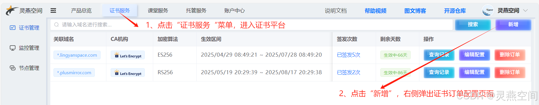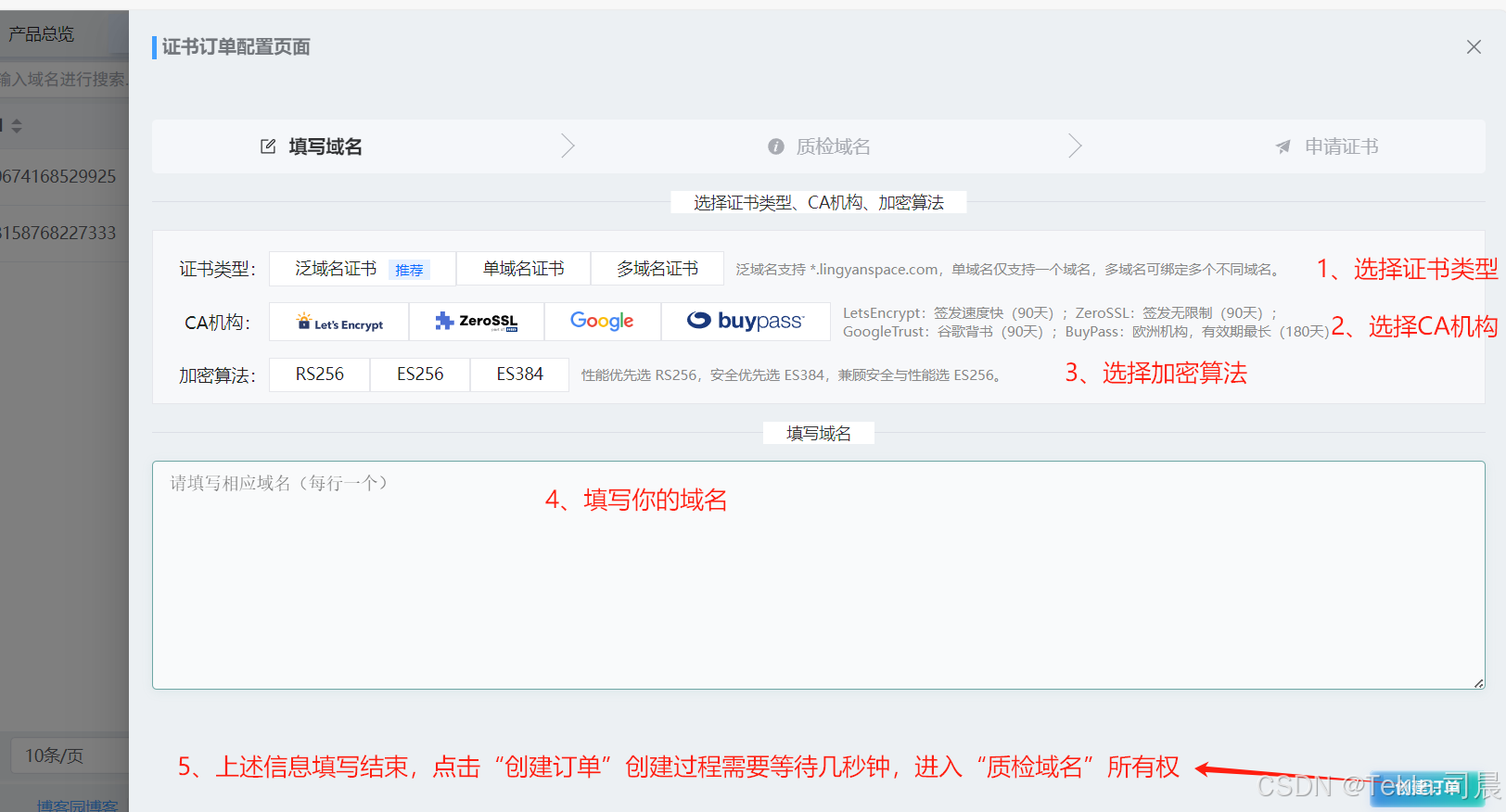 2、接下来依次:选择-证书类型、选择-CA机构、选择-加密算法、输入自己购买的域名, 拿我的域名plusmirror.com为例, 选择泛域名 输入 *.plusmirror.com