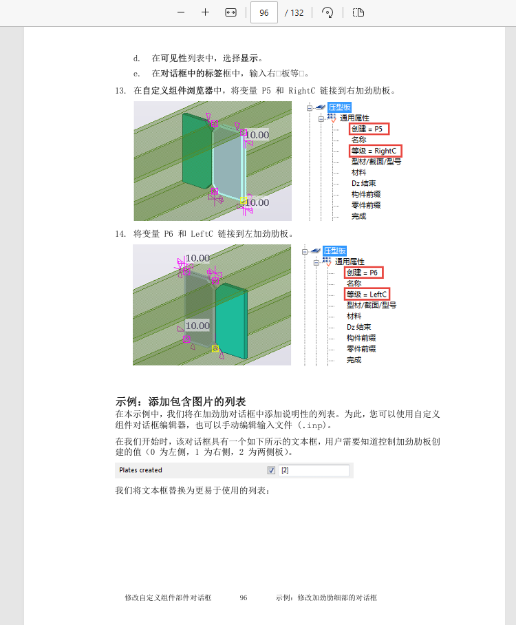- 嵌套组件: 可以将多个现有组件(如端板、加劲肋)组合成一个更复杂的嵌套节点,并通过“是/否”变量控制子组件的创建与否。