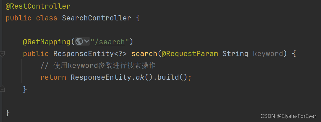 当请求URL中包含查询字符串时,如http://example.com/search?keyword=test,你可以使用@RequestParam来接收keyword参数: