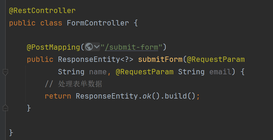 当表单数据通过POST请求提交时,你也可以使用@RequestParam来接收每个表单字段的值。这通常用于处理HTML表单提交的数据。