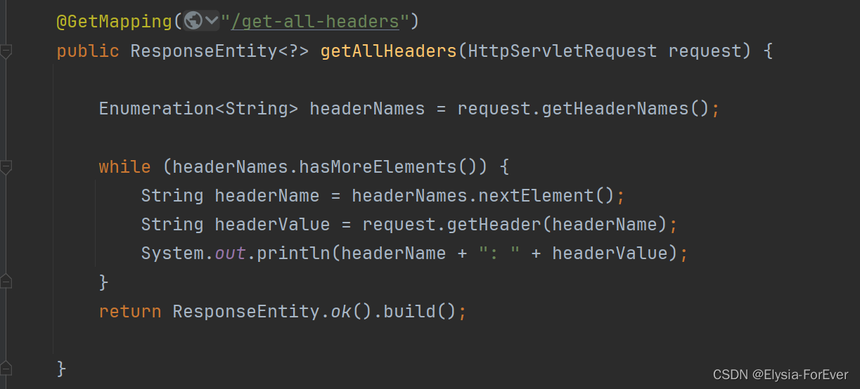 在这个例子中,我们注入了HttpServletRequest对象,并使用其getHeaderNames方法来获取所有请求头的名称。然后,我们遍历这些名称,并使用getHeader方法来获取每个请求头的值。这种方式提供了对请求头的完全访问,但相对而言代码会稍显繁琐。
