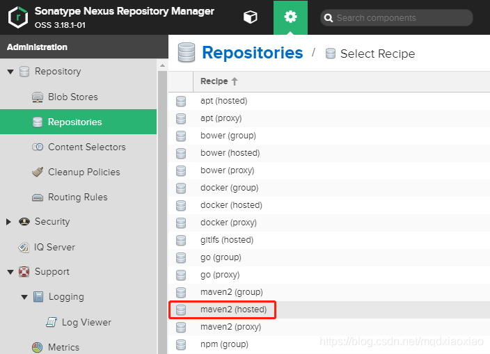 然后选择maven2(hosted),因为我们要搭建的是maven仓库