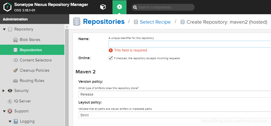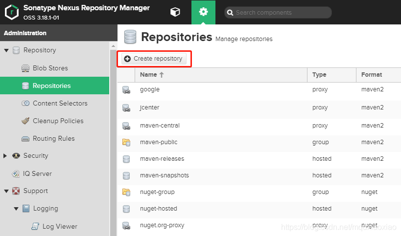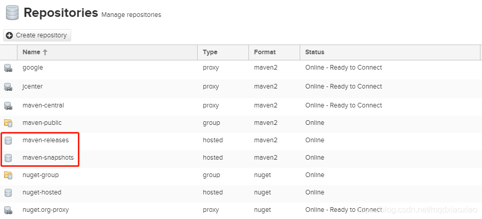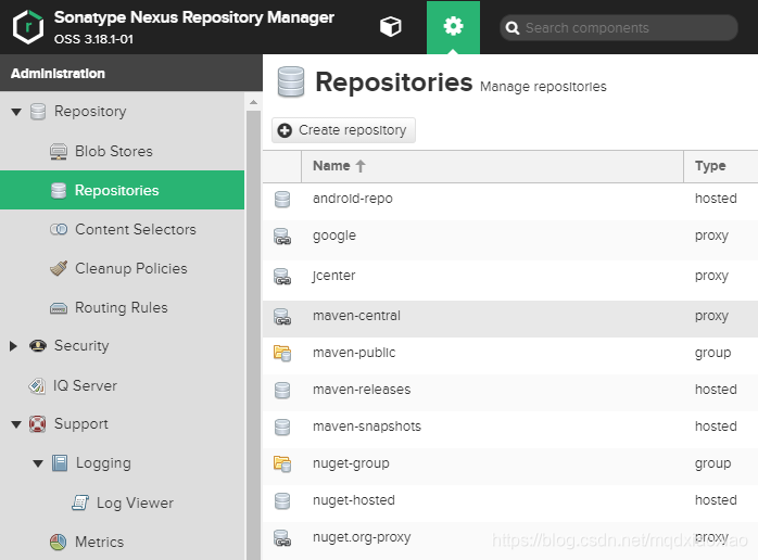 Nexus搭建成功后默认已帮我们创建了两个Maven hosted仓库,分别为maven-releases和maven-snapshots,这两个其实已经够用了,为了演示,我们创建一个专门存放Android开发包的仓库,就叫做android-repo吧