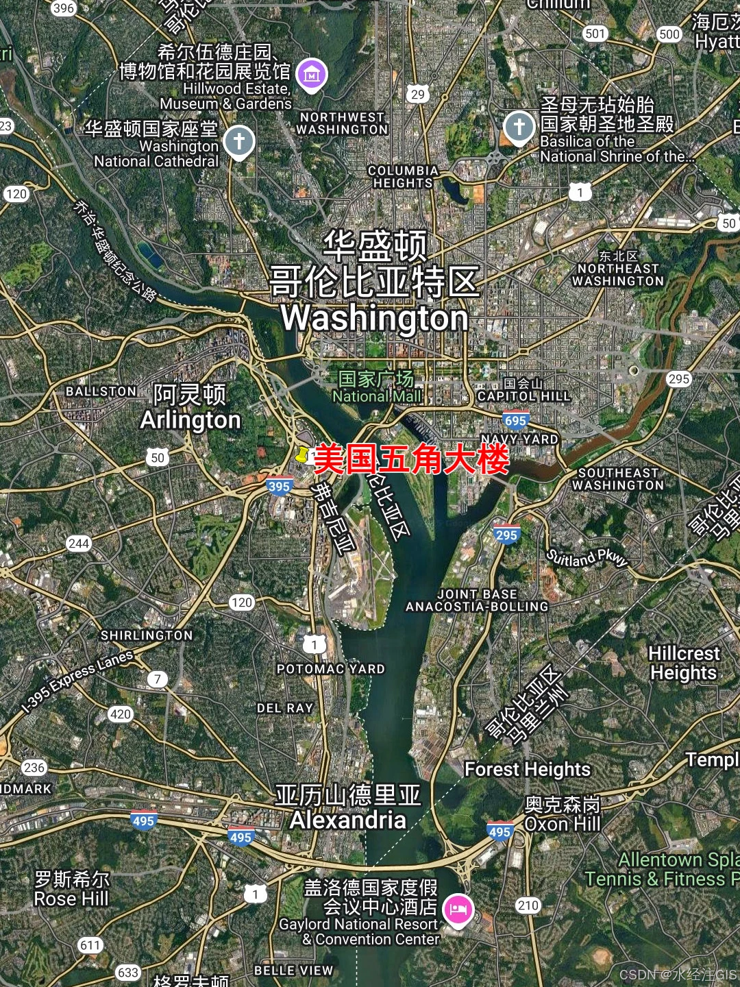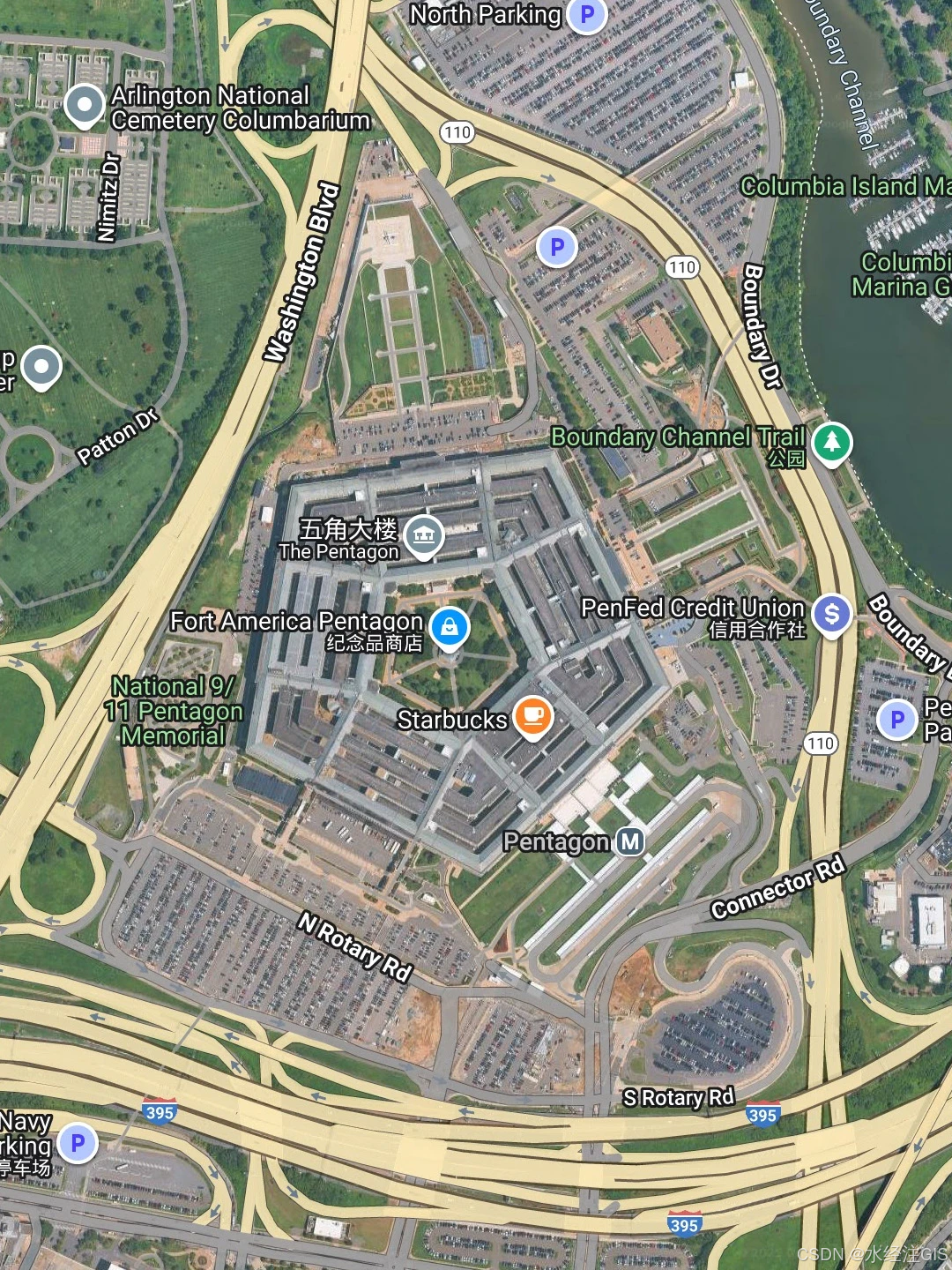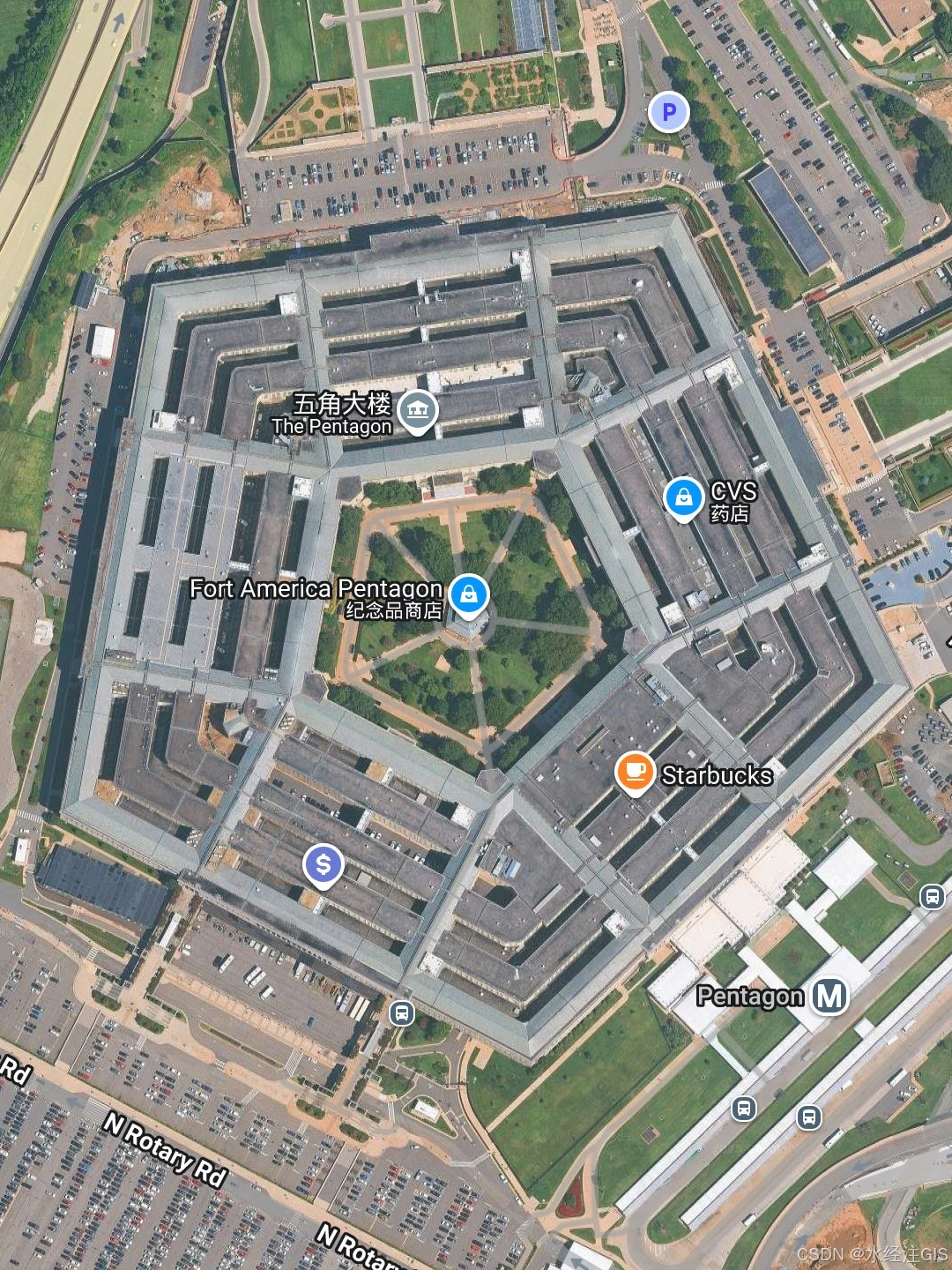 打开以下网址并切换到全球一张图,可查看美国五角大楼卫星影像。