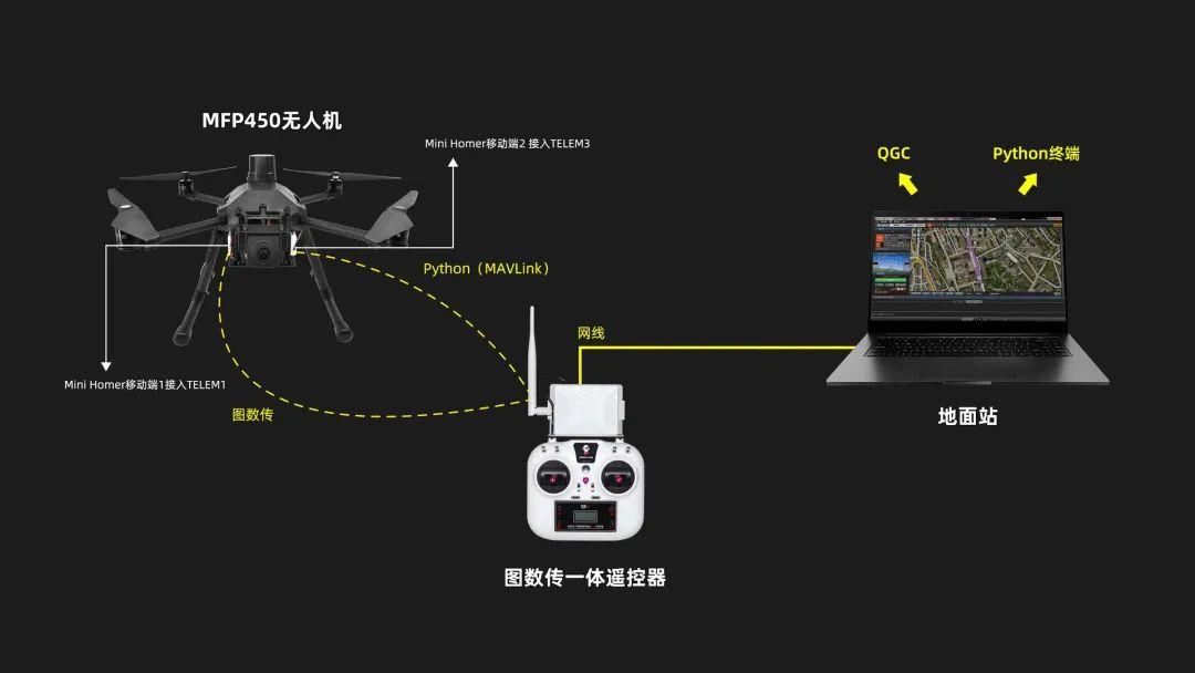 建议使用两路数传,QGC与MAVSDK各一路,方便更好的查看无人机状态以MFP450-V6C为例,在此基础上增加一个Mini Homer天空端,可增加MAVSDK使用时的安全性,同时也可以后续升级RTK版本硬件之一。具体方法:将新增加的Min Homer端口及目的端口设置为14540,可参考Mini Homer产品手册:https://docs.amovlab.com/minihomer-wiki/#/src/MINIHOMER/%E8%BF%9E%E6%8E%A5%E9%85%8D%E7%BD%AE%E8%AF%B4%E6%98%8E
