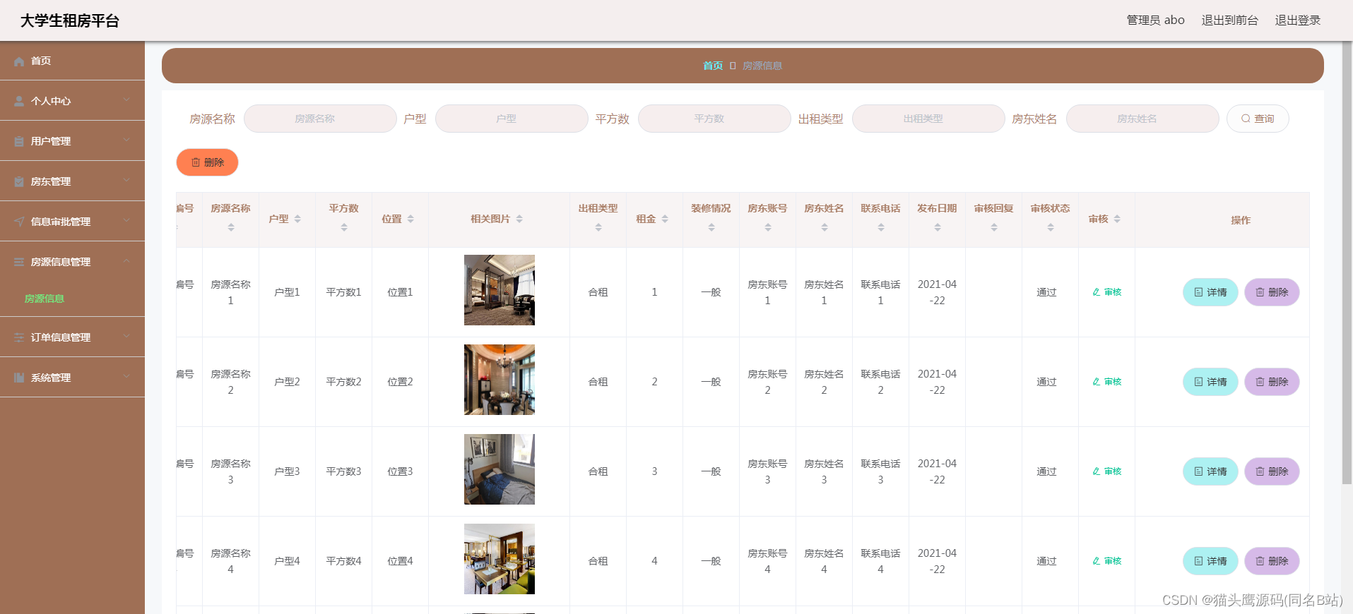 房东进入指定功能操作区之后可以管理房源信息。其页面见下图。房东发布的房源信息在进行正式出租前,也需要通过管理员的审核。