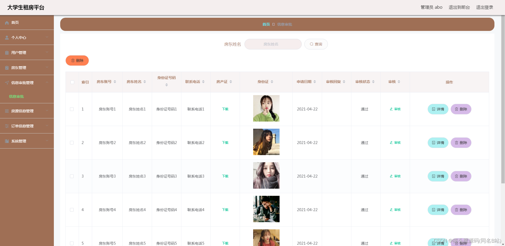 房东进入指定功能操作区之后可以管理信息审批信息。其页面见下图。房东查看信息审批信息是否通过审核,只有通过审核之后,房东才可以发布房源信息