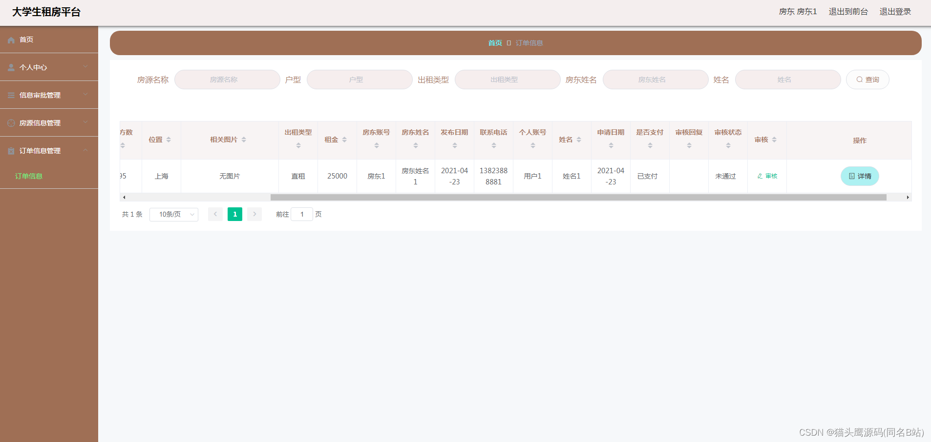 用户进入后台功能操作区之后可以查看订单信息。其页面见下图。用户支付未支付的租房订单,查看租房订单是否通过房东审核。
