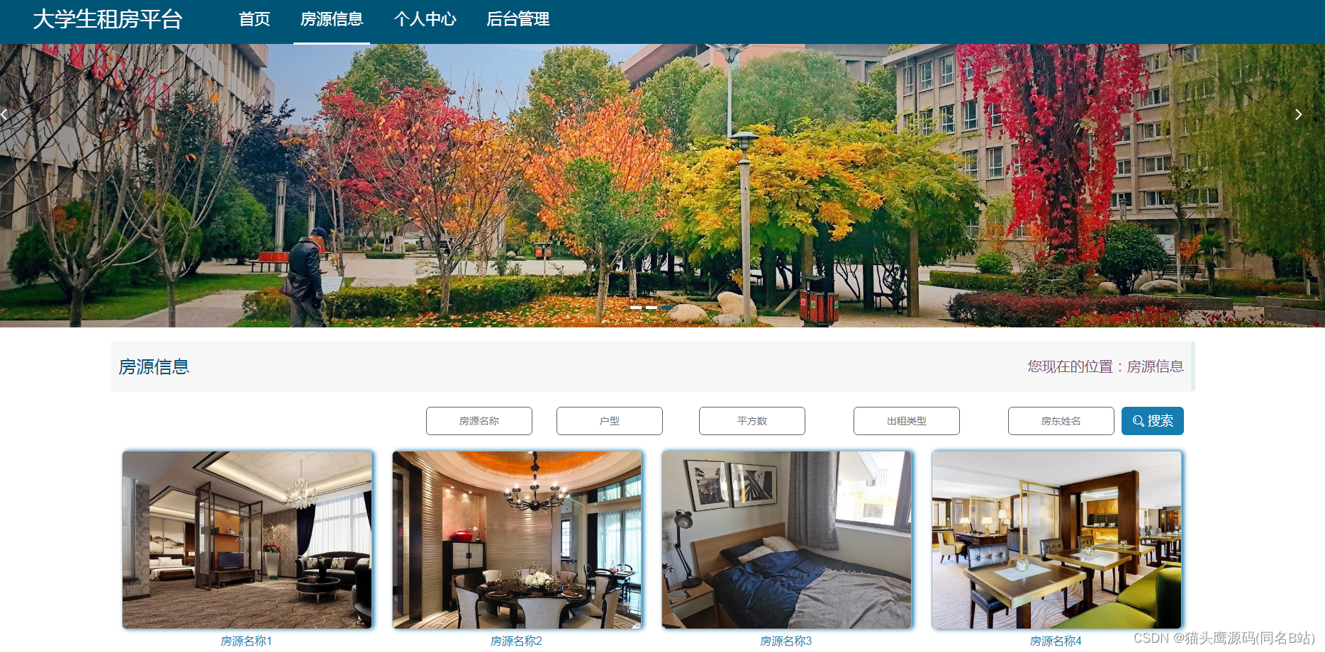 用户进入前台之后可以查看房源信息。其页面见下图。本页面显示所有要出租的房源信息,用户可以根据房源名称,户型,出租类型等字段查询所需房源信息。