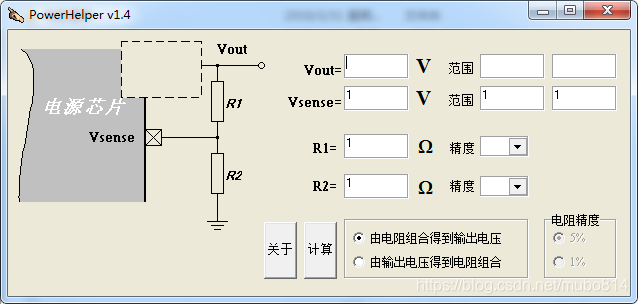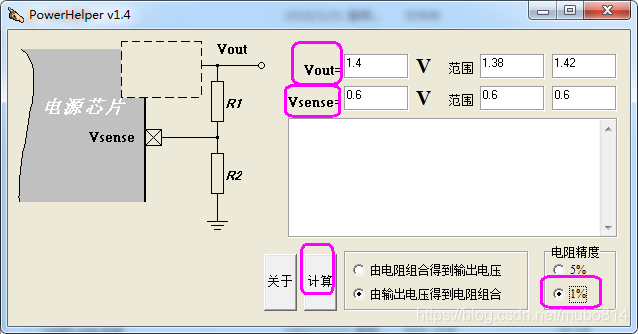 输入Vout电压和范围,输入Vsense电压(自动带出范围,最大最小值和Vsense相同,不要改),电阻精度选1%,然后点“计算”按钮,则生成结果,如下图: