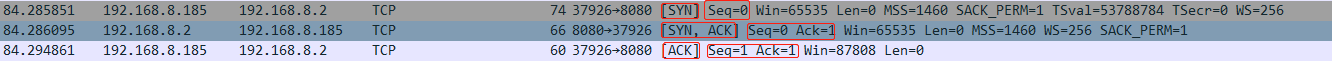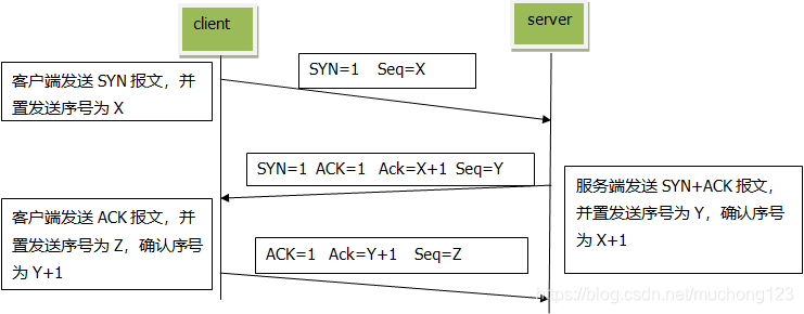 客户端发送一个TCP的SYN标志位置1的包指明客户打算连接的服务器的端口,以及初始序号X,保存在包头的序列号(Sequence Number)字段里,此时客户端进入SYN_SEND状态,等待服务器B确认。