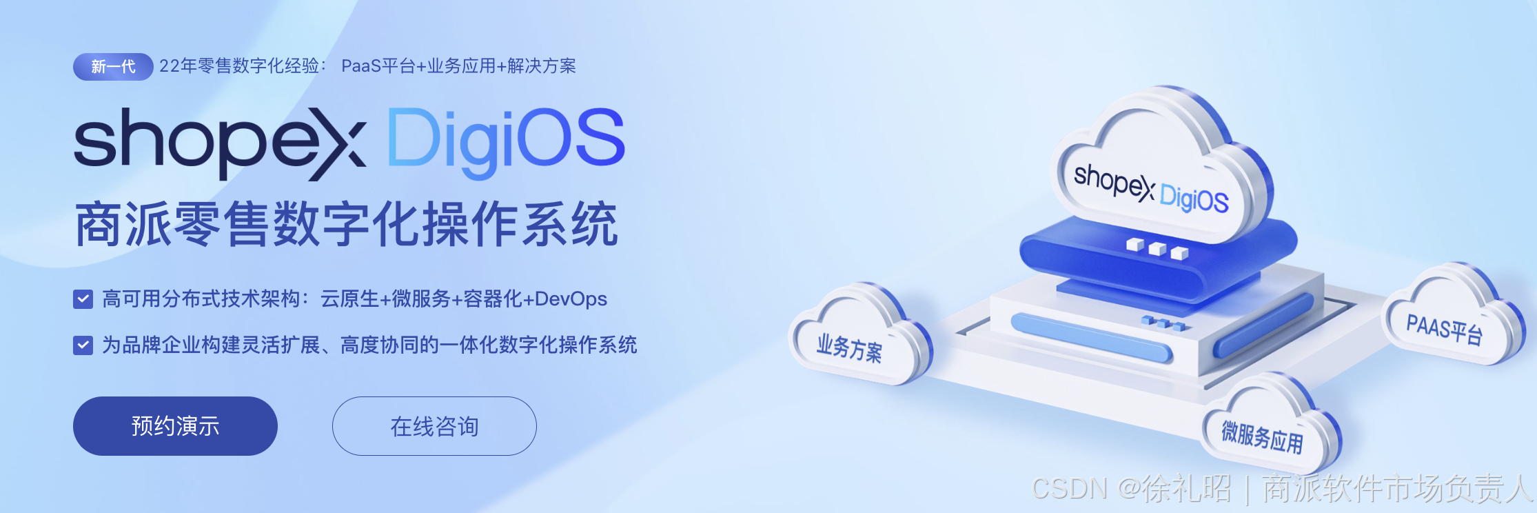 商派 DigiOS 数字化操作系统采用的就是 “云原生 + 微服务 + 容器化 + DevOps” 先进技术架构。其核心价值在于商派基于22年的数字化服务经验,打造了专业强大的零售数字化 PaaS 平台。在云原生和微服务等技术基础上,该平台具备丰富的零售数字化标准产品库和服务组件,具有灵活高效的扩展能力、组装能力和协同能力,能支持不同数字化业务应用快速开发、数据协同和功能创新,满足不同中大型集团企业个性化业务发展需求,也更易与其他外部系统对接集成。