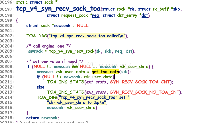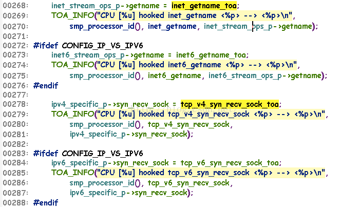 的结构体里并通过toa内核模块hook了getname函数,这样当用户调用getname获取远端地址时,返回的是保