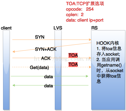 主要原理是:将client address放到了TCP Option里面带给后端RealServer,RealServer收到后保存在socket
