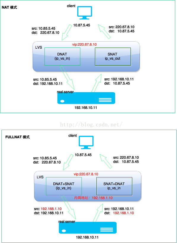 下面的图来自吴佳明(普空)的PPT, 自己重画了一遍,关于NAT和FULLNAT的区别如下图所示: