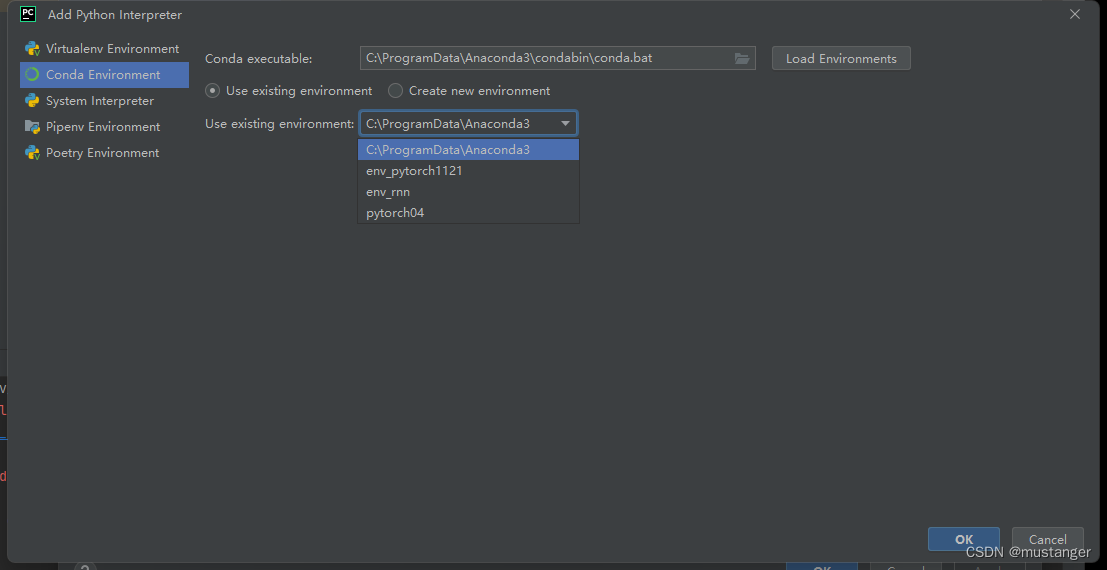 在新页面中选择Conda Environment ,单选Use existing environment,