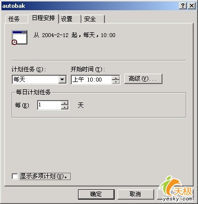 实例十四:计划任务备份 以上的到时间备份、监视文件夹备份方式,每次重启系统会都会要重新执行以上命令,还远远不够智能,如果能和Windows的计划任务配合,所有问题就迎刃而解了。以我们要在每天10:00自动调用Robocopy开始监视备份文件夹为例,说一说计划任务与Robocopy的携手。 第一步:新建BAT文件 新建一个批处理文件autobak.bat,输入如下命令 robocopy d:/work e:/back /e /copyall /mot:1 /mon:2 第二步:创建计划任务 选择“开始→设置→控制面板”,双击“任务计划”图标。把autobak.bat批处理文件拖放到“任务计划”窗口,然后双击新生成的autobak.bat图标,在弹出窗口中设置其属性。 第三步:设置开始时间 切换到“日程安排”标签,单击“任务计划”下拉列表框,从中选择“每天”,“开始时间”设置为10:00,单击“高级”可以设置起止的日期(如图4)。