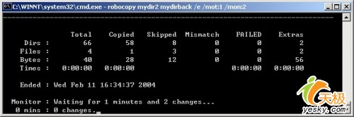 [实现效果]希望每天能够把相应数据备份到文件服务器上,以免数据丢失。 [简单命令] robocopy d:/work //yesky_server/articles/share /e /copyall [参数讲解] 从中可以看出,robocopy完全支持文件服务器共享文件夹数据的拷贝。 [举一反三] (1)如果我们创建了一个环境变量,如定义%databack%为//yesky_server/articles/back,那只要输入相应的命令:robocopy d:/work %databack% /e /copyall 即可把d:/work下的文件全部备份到//yesky_server/articles/back下。当然,如果//yesky_server/articles/back空间不够时,只要更换环境变量的值到其他文件夹,如//yesky_server/articles/newback,上述命令无需更改就可以反数据拷贝到新的文件夹中。 (2)如果你只想把数据备份到共享文件夹中以你的机器名为名字的共享文件夹中,使用xxcopy会更方便:xxcopy d:/work //yesky_server/articles//$HOST$ /e /yy 其中/$HOST$表示你的机器名,如你的机器名为yesky_SYJ,那会把d:/work 文件夹下的文件拷贝到//yesky_server/articles/yesky_SYJ文件夹下。如果你的机器名为yesky_MLB,那执行上述命令后就可以把d:/work 文件夹下的文件拷贝到//yesky_server/articles/yesky_MLB文件夹下。由于同局域网内的机器名字不会相同,执行上述命令后就可以保证数据不会被拷贝到同一文件夹下。 实例十二:一动就备份 [实现效果]有些工作内容非常重要,需要时时刻刻注意备份,可是我们哪里有这么好记性和耐性呢?这事,还是交给Robocopy来做吧。Robocopy能时时监视要备份的文件夹,只要文件夹修改到一定时间和程序,Robocopy就会立即开始备份。它会一直监视文件夹,除非用户自己终止。 [简单命令] robocopy d:/work e:/back /e /copyall /mot:1 /mon:2 [参数讲解] 上述命令表示复制文件夹所有信息到目标文件夹并进行监视。执行此命令后,命令提示符窗口如图2所示。一旦时间过了一分钟,并且源文件夹至少有或2处以上的修改,Robocopy就会自动启动另一个进程,执行上述备份操作。Robocopy能监视源文件夹结构、文件和文件夹名称、大小、最后修改时间,在这里,甚至连属性和权限等信息被修改时,Robocopy也会记为修改次数。