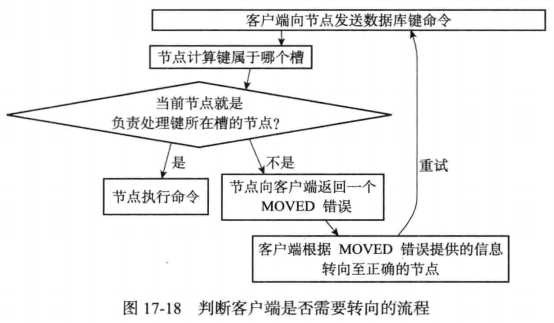 节点在接到一个命令请求时,会先检查这个命令请求要处理的键所在的槽是否由自己负责,如果不是的话,节点将向客户端返回一个MOVED错误,MOVED错误携带的信息可以指引客户端转向至正在负责相关槽的节点。