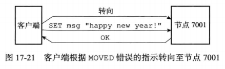 如果键所在的槽并没有指派给当前节点,那么节点会向客户端返回一个MOVED错误,指引客户端转向(redirect)至正确的节点,并再次发送之前想要执行的命令。