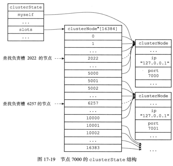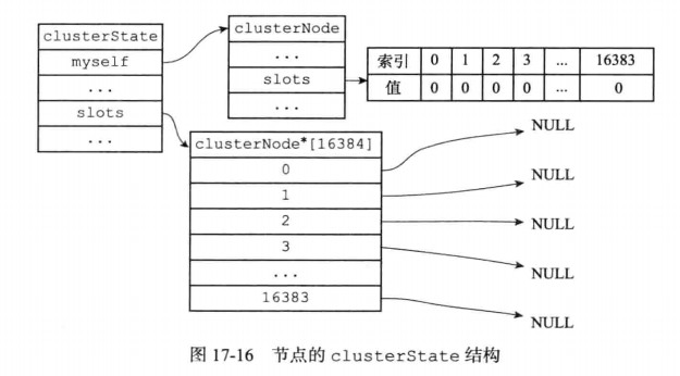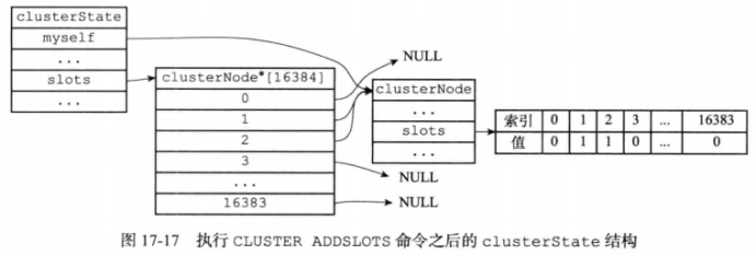 将槽1和槽⒉指派给节点之后,节点的clusterstate结构将被更新成图17-17所示的样子: